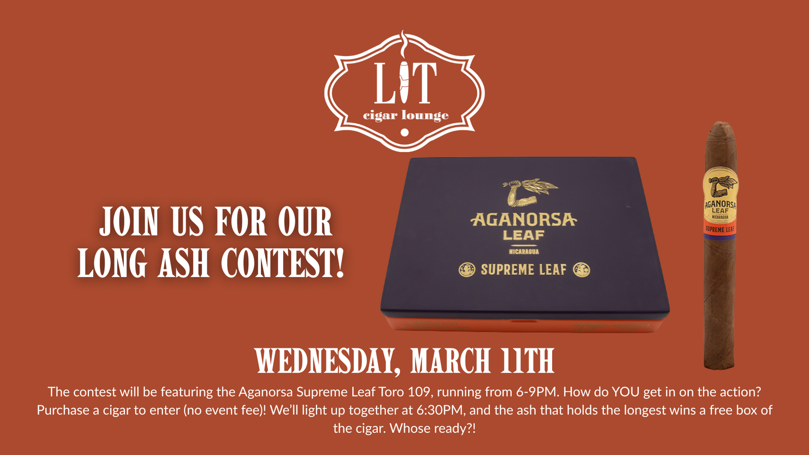 Whose joining in on the competition? 👀💨 We'll be hosting the Long Ash Contest on March 11th from 6-9PM, open to the public. All you have to do is purchase a cigar to get in on the action. We'll be smoking the Aganorsa Supreme Leaf Toro 109. What's the grand prize?! A whole box of […]