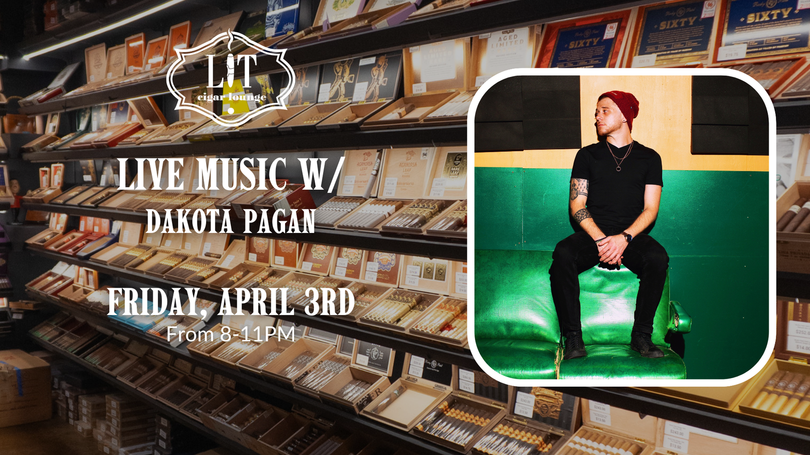 Kick off your Friday night the right way Set the vibe with premium cigars, live music, and an unbeatable crowd. Dakota Pagan will be bringing the sound live from 8-11PM, so come relax, light up, and enjoy an awesome night!