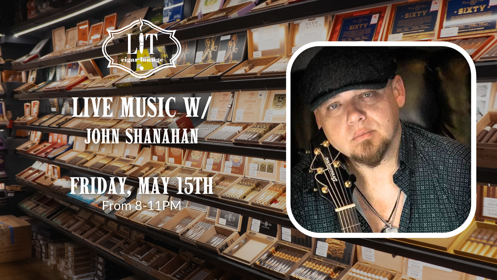 Join us for a LIT Friday Night filled with great cigars, great music, and great company. Featuring live music from John Shanahan from 8-11PM!