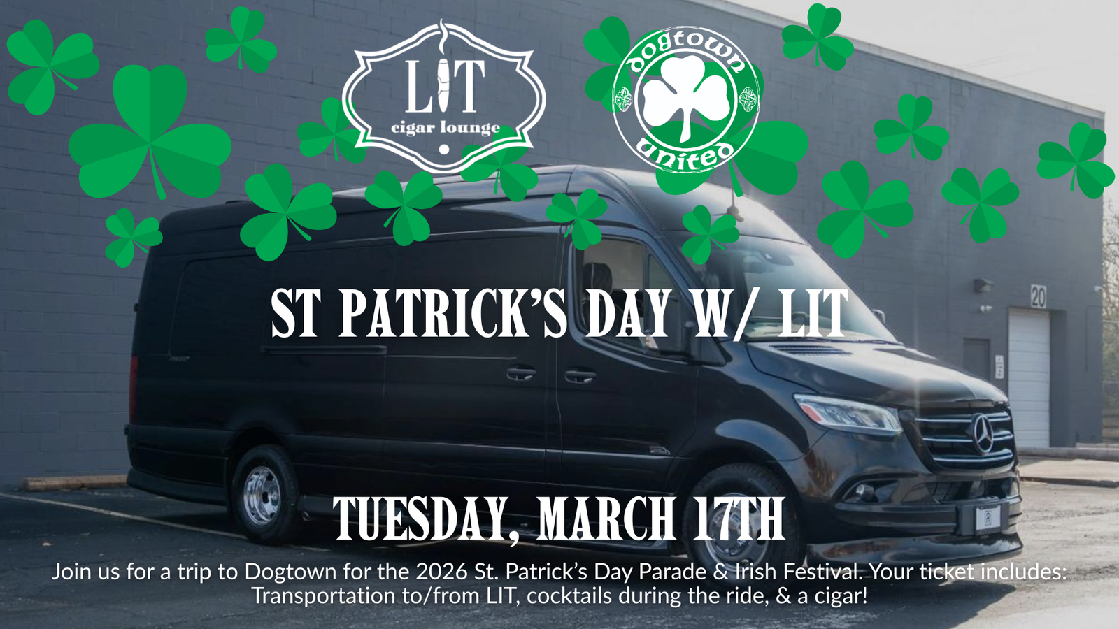 LIT Cigar Lounge 17049 N Outer 40 Rd, Chesterfield, MO, United StatesJoin us for a trip to Dogtown for the 2026 St. Patrick's Day Parade & Irish Festival 🍀 Your ticket includes: Transportation to/from LIT, cocktails during the ride, & a cigar! We will have a mobile lounge set up as well!
